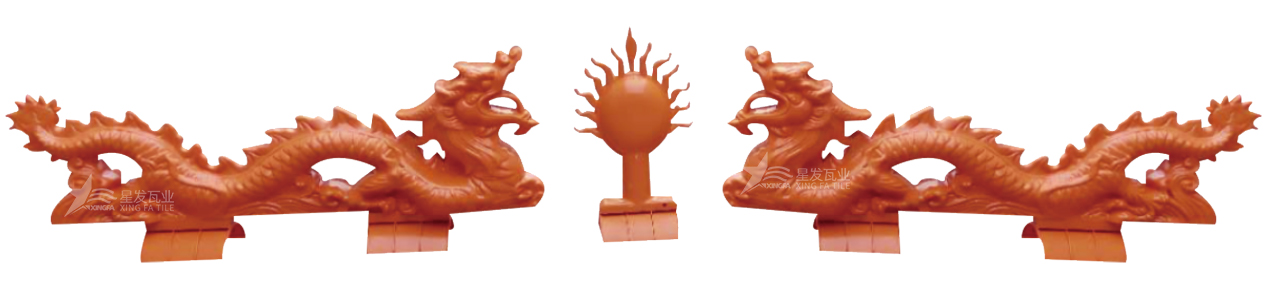 樹(shù)脂瓦配件-雙龍玩珠:樹(shù)脂瓦屋頂上的裝飾性配件。它們安裝在屋脊的兩端,提供裝飾效果,增添屋頂?shù)娜A麗感。