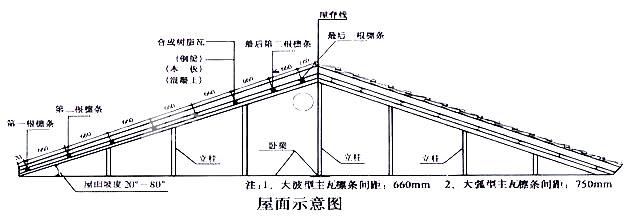 檁條是用于支撐樹脂瓦的結(jié)構(gòu)元素。常用的檁條材料包括木方、方鋼管和C型鋼,它們需要經(jīng)過防腐處理。最上面的檁條距離屋脊線150mm,最下面的檁條距離屋檐口50~70mm。主瓦檁條的建議間距為660mm,大弧型主瓦檁條間距不得大于750mm。